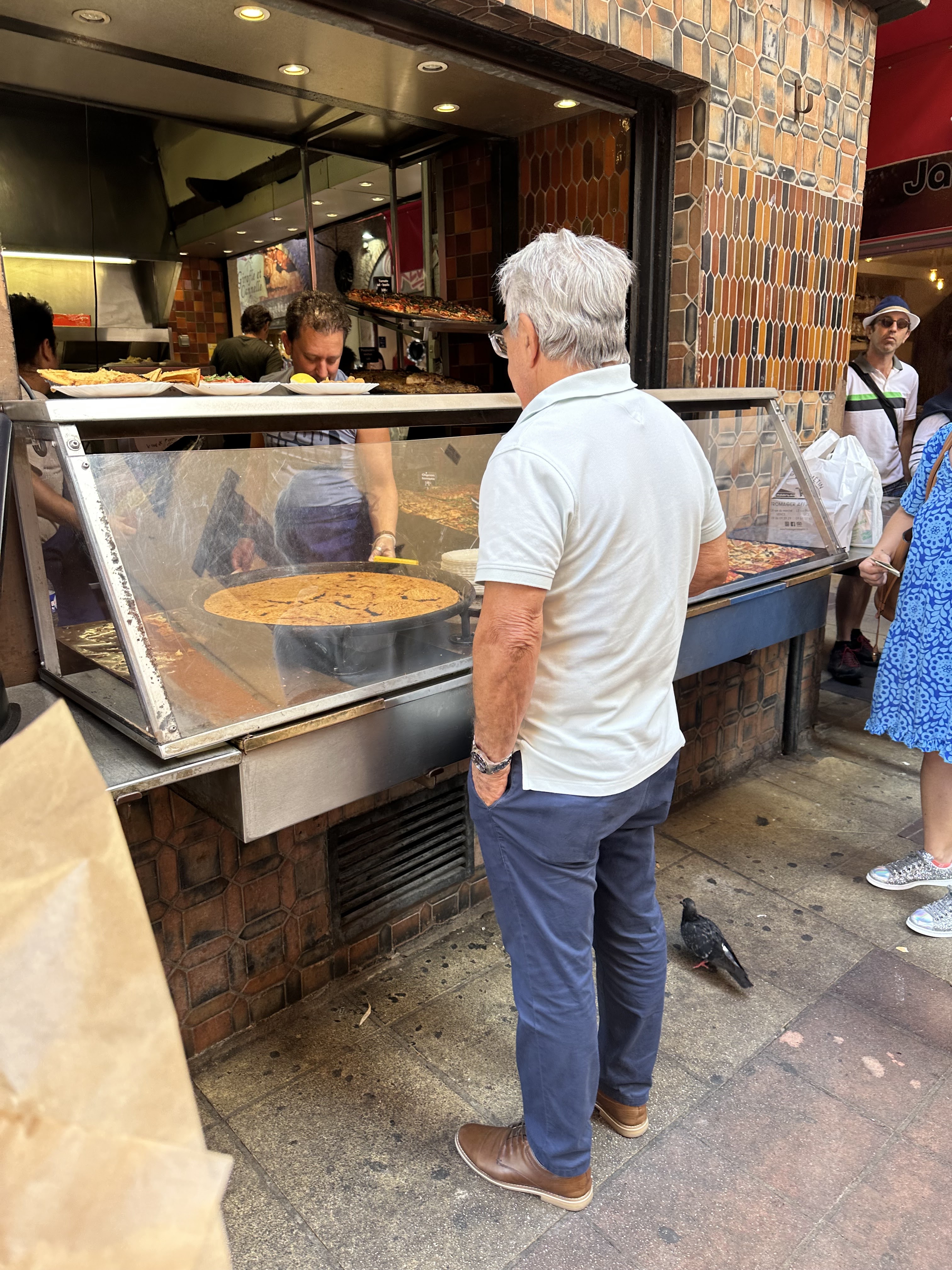 The second speciality was the chickpea pancake found from Provence to Liguria. These smoky, satisfying wedges of fried batter, are chopped up unglamorously and doled out among handfuls of napkins, it's called socca, and you eat it doused in olive oil with black pepper and rock salt. Totally satisfying, oily, salty.. and cheap! the dough (pronounced 'doubt' by Constance - love it) is chickpea flour and water. That's it - leave it to bubble, whip it up and cook it in an oily pizza base tray at 500 degrees c. Pretty hot huh?